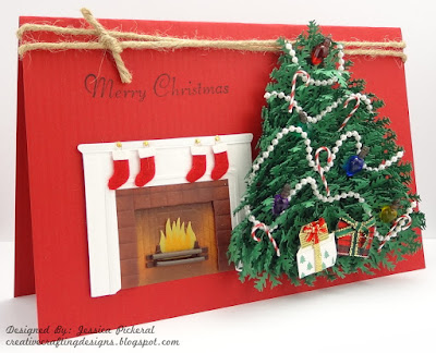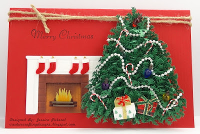 Now that the evergreen tree is finished it’s time to decorate the card. I first attached the fireplace which is a Jolee’s Boutique Dimensional Sticker, and then glued down my tree. The “Merry Christmas” sentiment was applied using a miscellaneous clear stamp from my stamp collection. For a final touch I tied some twin to the top of the card.