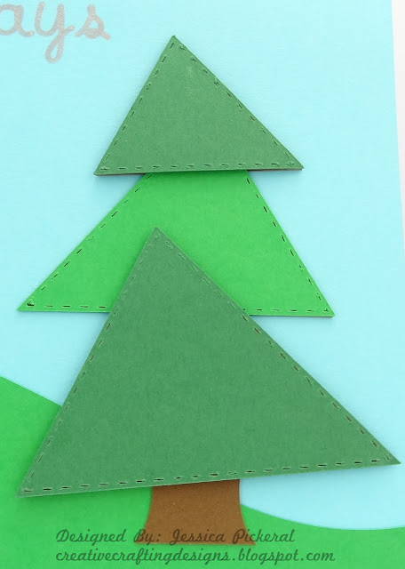 Now for the best part of my “Happy Holidays” card; the “Stitched Tree” SVG Digital Cut File. The “Stitched Tree” is today’s FREEBIE for the hop. I’m so excited about this SVG File because I actually designed it. I cut the Stitched Tree out with my Cricut Explore – *Because this is a stitched file, it can not be cut out as a small embellishment, it’s meant to be more of a medium size or focal point embellishment. When attaching the pieces of the Stitched Tree I used Elmer’s CraftBond Foam Mounting Tape on the top and bottom piece to give the tree a little dimension.