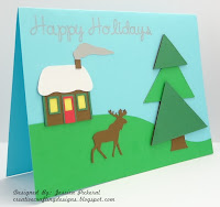 The grassy hill and winter cabin is from the My Treasured Kutz SVG Digital Cut File called “Winter Mountain Scene Background Card” which was cut with my Explore. When I cut my card base on the Cricut Explore I also used the pen tool and “Has a Writing Style” option to write the sentiment “Happy Holidays”. The font I chose was Baby Steps and I used the Cricut silver metallic marker.