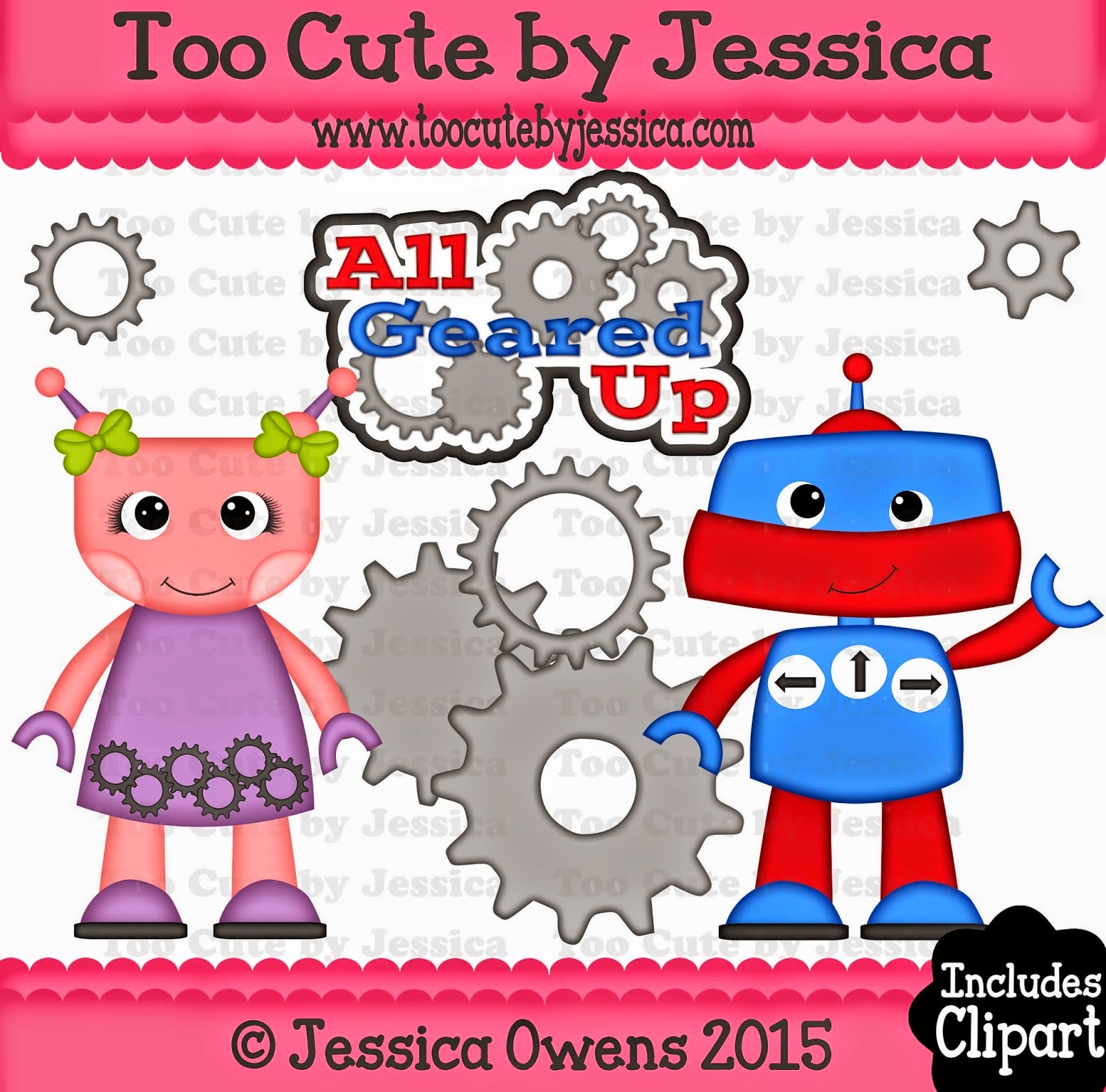 I used my Cricut Explore to create this adorable card. The sweet robot girl was cut using Too Cute By Jessica (TCBJ) newly released SVG file “All Geared Up“. The pink scalloped border was also cut from a TCBJ SVG, “Borders Set 1“. I inked just about all my pieces using American Crafts pigment ink and disposable lip applicators. I also added a touch of white using a Sakura Gelly Roll white gel pen.
