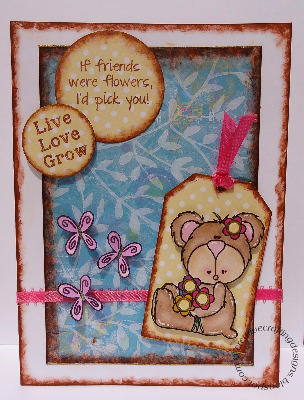 These sweet sentiments are also from the CDD Blooming For You stamp set. I stamped them with Rubber Stampede dye-based ink. Then, I attached everything to the card, I used foam tape on the small circle and bear to make them pop out a little.
